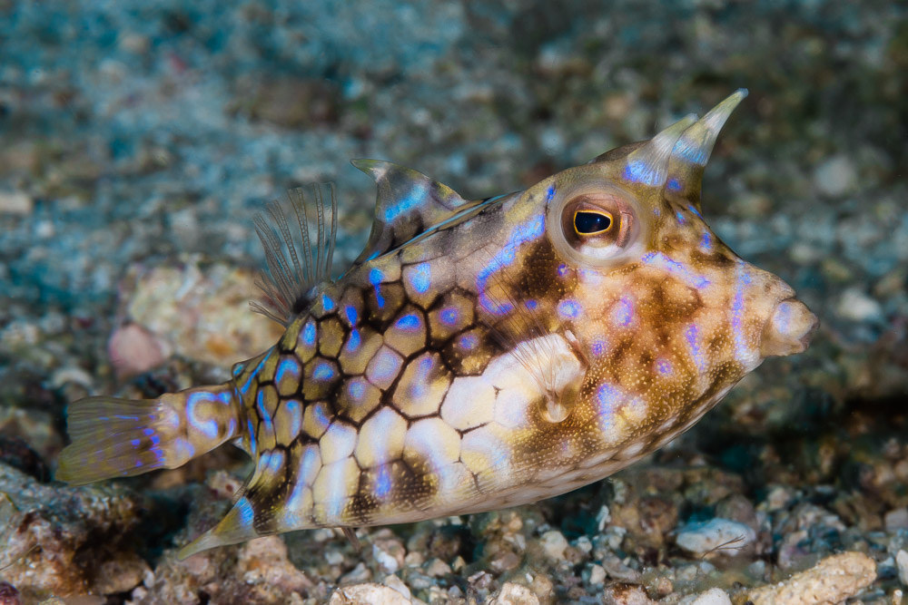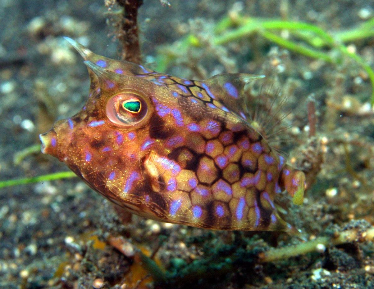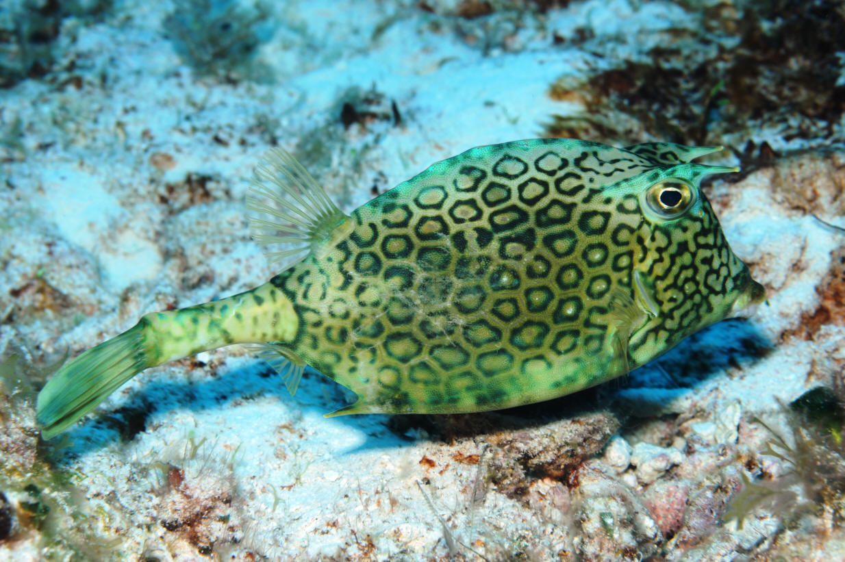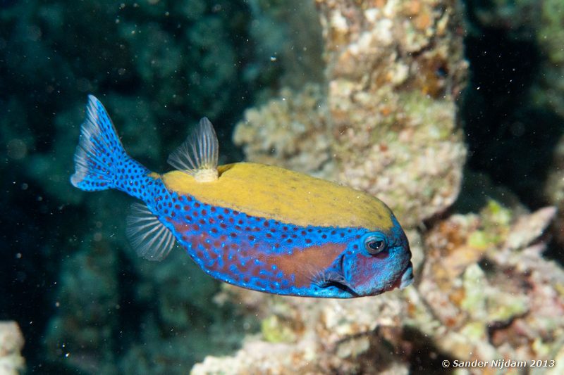 - Un pez cofre adulto empieza a tomar un color azul metálico con sedimentos amarillos entre las placas.